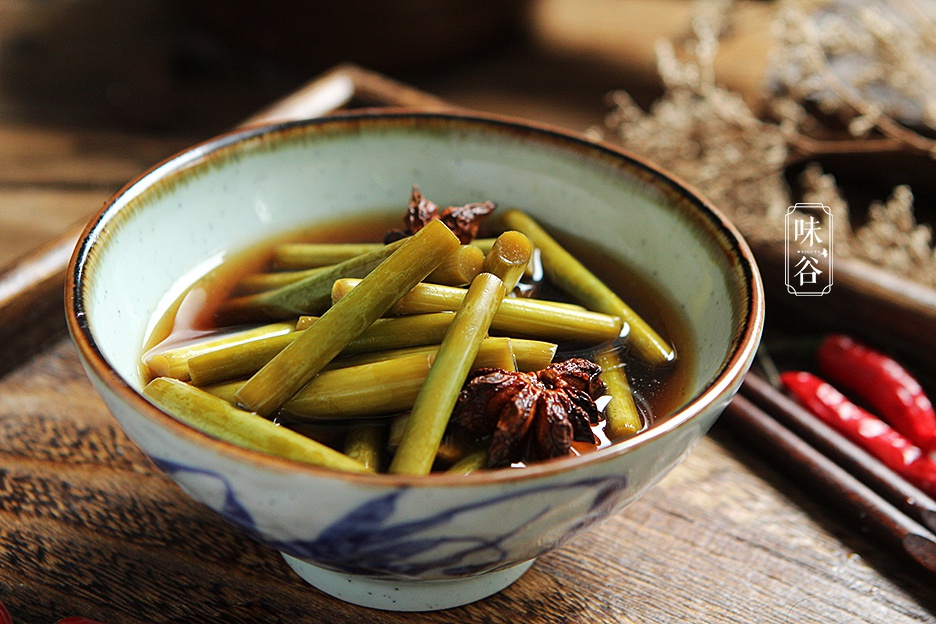 【材料】:蒜苔1把、花椒适量、八角3个、陈醋1碗、生抽2汤匙、盐4茶匙、姜适量