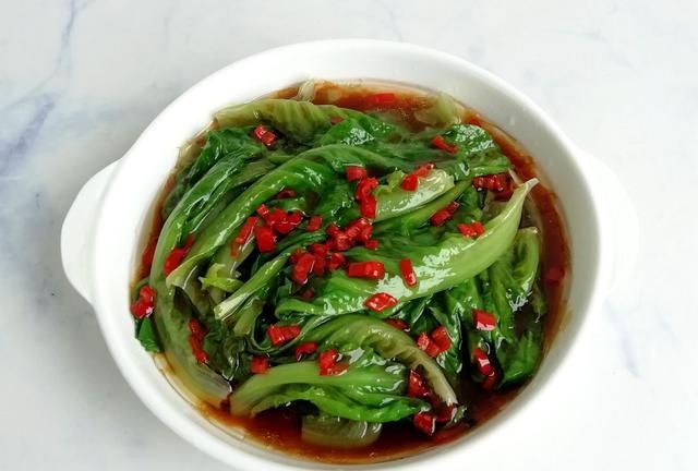 具体做法:碗里倒入适量清水,加入适量盐、白糖、生抽、蚝油、生粉,搅拌均匀,调成料汁。生菜洗净,放入开水锅里,淋入少许花生油,焯烫至变色后,捞出,沥干水分,装入盘中。热锅倒油,放入适量红辣椒粒炒香,再倒入料汁烧开,淋在生菜上即可。