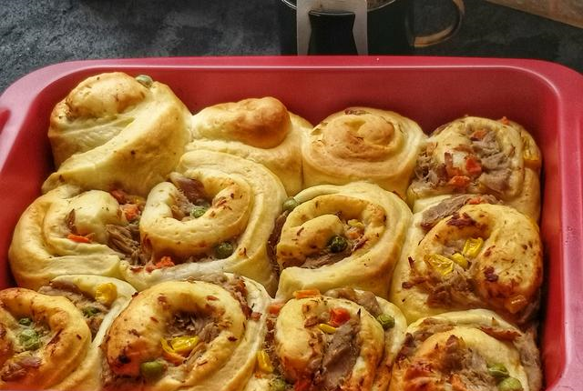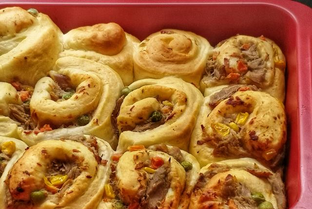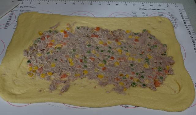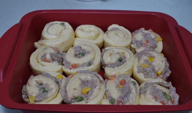 4 在面团发酵的过程中,处理一下馅料,炒锅放少许油,放入胡萝卜粒、玉米粒和青豆炒一下,放入金枪鱼鱼肉炒匀,关火后,放1勺沙拉酱拌匀,面包卷的馅料就做好了。5 面团发酵到原来的2倍大,很多人都会问发酵要多长时间,发酵时间要看温度和湿度来决定,室温25度,大概45分钟。
