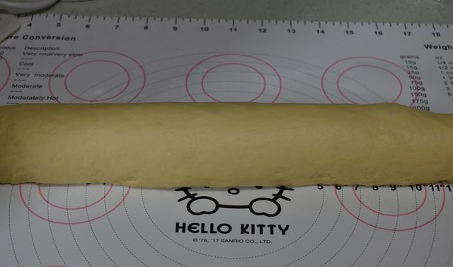 9 把面片卷起来成圆柱体,切成大致3厘米厚的小段。