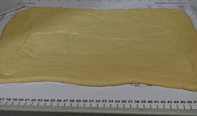 7 把面团擀成放长方形,尽量把面片擀得厚度差不多。