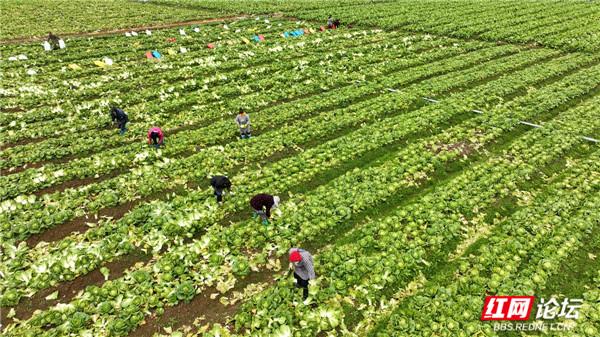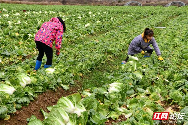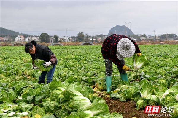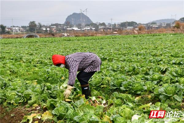 图说:2月14日,江永县潇浦镇上界头村果蔬农业合作社千亩供粤港澳大湾区蔬菜基地,年后第一次收获白菜。