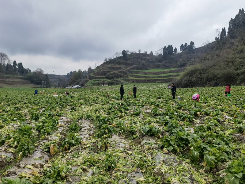 据了解,农庄社区共种植儿菜500余亩,每亩产量可达5000斤左右,从2月中旬开始采收,预计总产值70余万元。(图/文?陈昱、郭明丛)