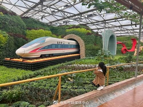 “八号馆是蔬菜文化艺术馆,集中展示蔬菜文化艺术景观,馆内以落实党的二十大精神为主线,融合蔬菜文化、廉政文化、地域文化等,精心设计打造‘奋进新时代’‘希望的田野’‘寿光影像’等大型蔬菜景观,尽显蔬菜、科技、文化相融合的蓬勃魅力。”跟随着菜博会导游,记者走进了八号馆,映入眼帘的是宽敞的廊架与满眼绿意的菜境,这是“绿绘菜乡”景观,为展馆提供了富有生机、充满感性活力的过渡空间。