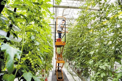 近日,在河北省永清县龙虎庄乡农业农村部规划设计研究院永清精准试验基地内,工作人员对西红柿进行绕蔓。