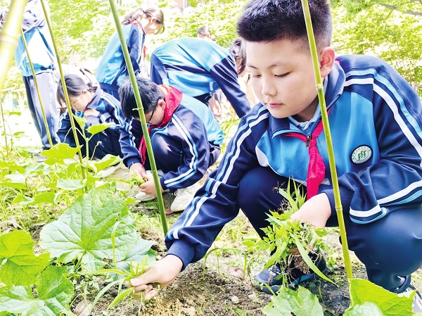 5月9日,同学们在学校蔬菜园里打理自己种的绿色蔬菜。浙江省桐庐县三合初级中学为做好近视防控工作,开展“寻找绿色蔬菜”近视防控特色活动,同学们在打理自己种的绿色蔬菜的同时,也放松了眼睛,享受绿色和阳光。本报记者 郑纯胜 通讯员 沈洁琳 摄影报道