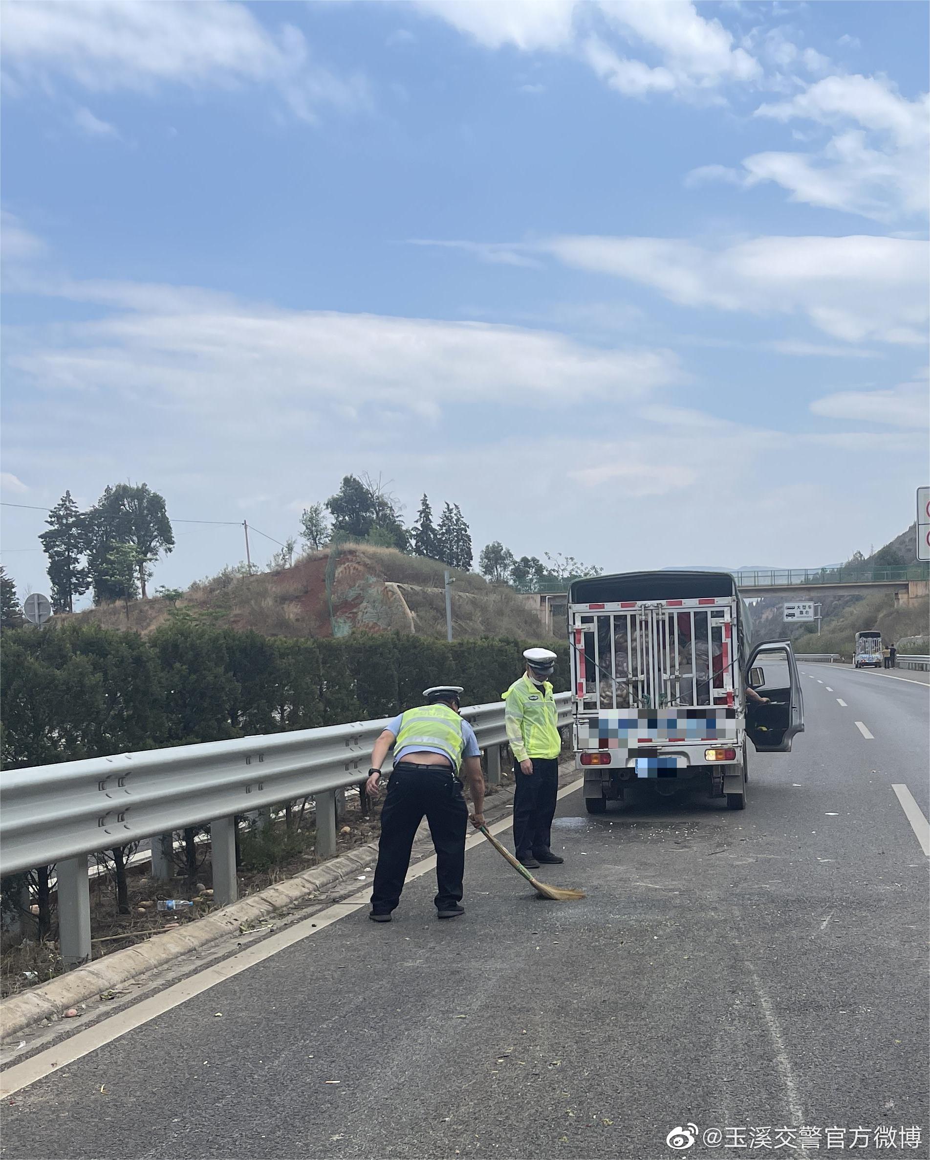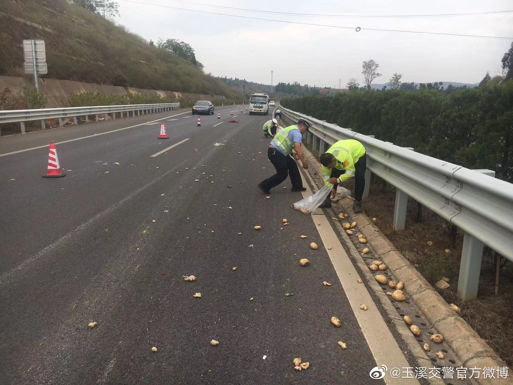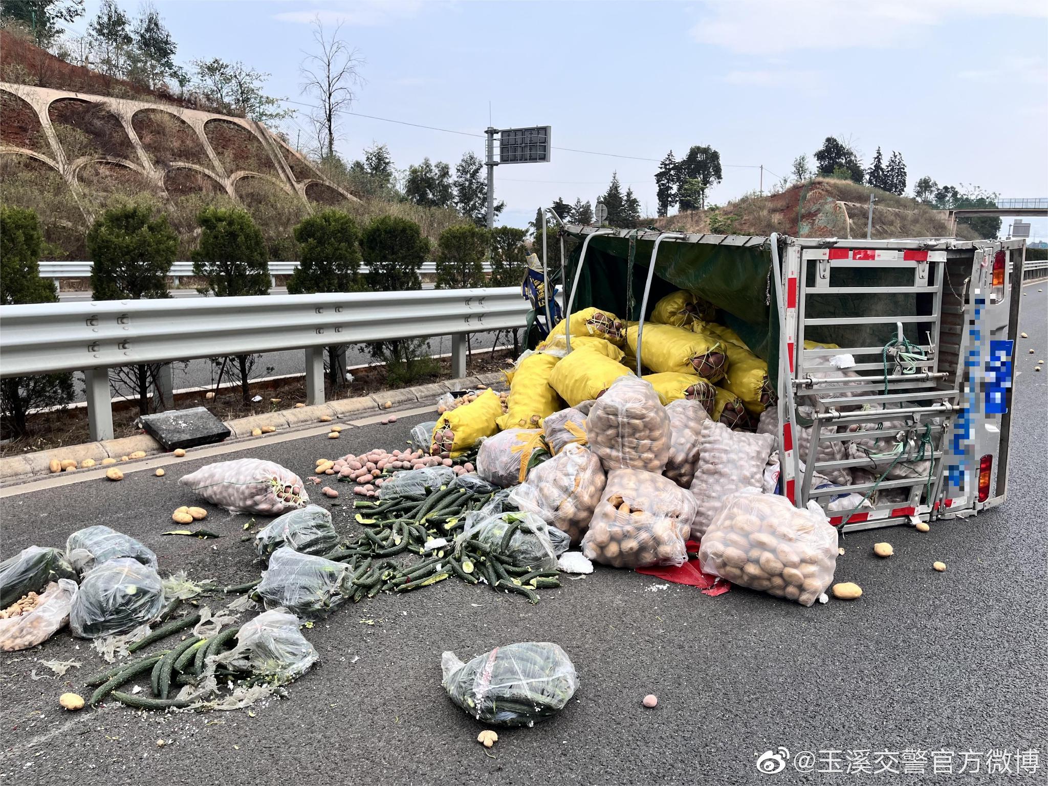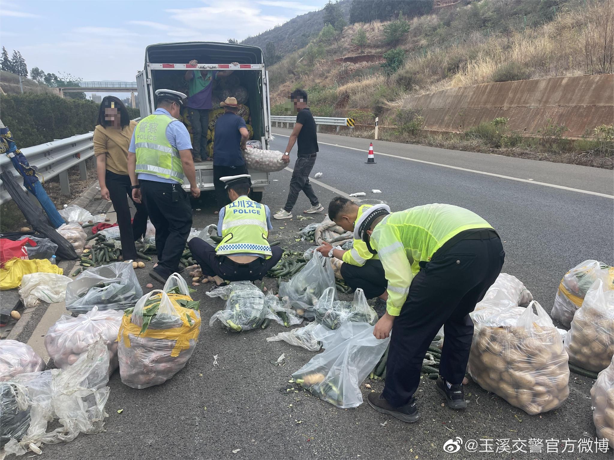 春季守护行动4月24日上午9时许,龙师傅驾驶一辆装有蔬菜的小货车途经澄川高速江川路段时,由于车速较快导致车辆侧翻,车内所载的蔬菜散落一地。为了尽可能帮龙师傅降低损失,玉溪江川交警一边进行现场警戒和疏导车辆,一边帮忙抢收满地的蔬菜。经过四十多分钟,蔬菜放上转运车及时转运,现场也被交警清理干净,有效避免了二次事故。@云南交警 @云南警方 @云南政法