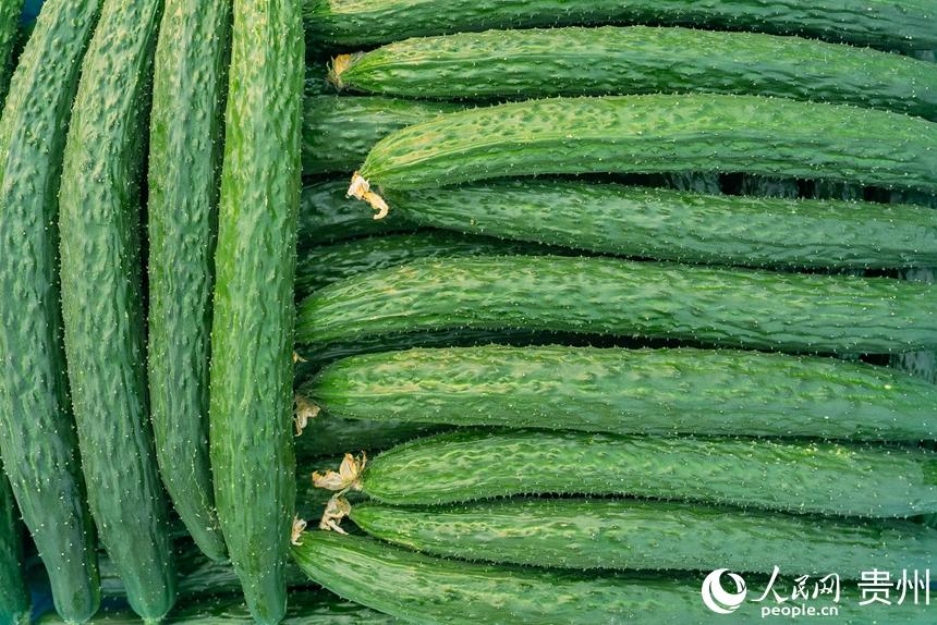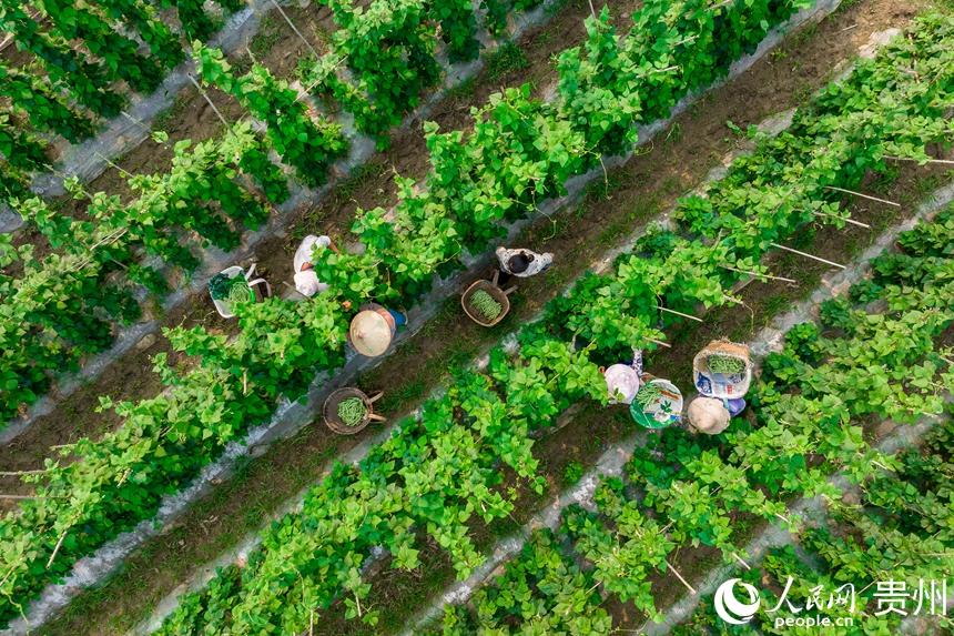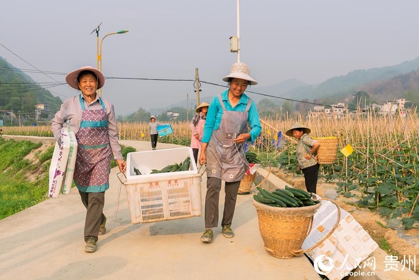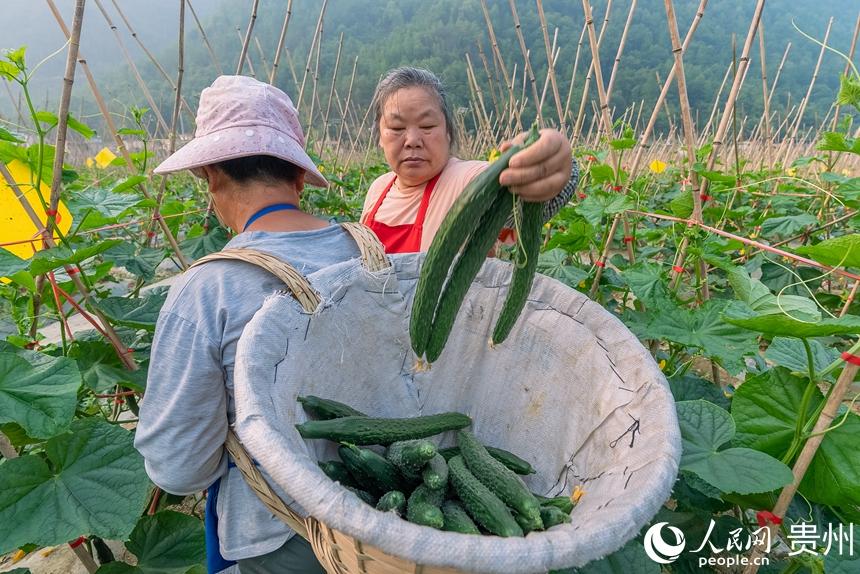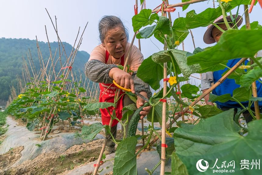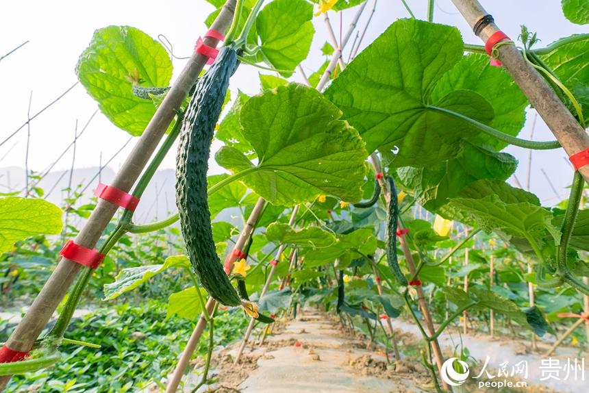 人民网罗甸4月25日电 (记者涂敏) 4月23日,在贵州省黔南布依族苗族自治州罗甸县逢亭镇祥脚村1500亩标准化蔬菜种植基地内,村民们正抓紧采摘成熟的黄瓜与四季豆,这些刚刚采摘的蔬菜将会以最快的速度出现在贵阳、湖南、广东等大中城市的市场中,丰富市民的餐桌。   近年来,当地根据高温低海拔的特点,采取“菜-菜-稻-菜”等一年多熟高效种植模式大力发展蔬菜产业,以提高土地利用率和复种指数。该村目前所采取的“企业+村合作社+农户”发展方式,已带动700余户发展蔬菜种植3000亩(次),蔬菜年生产总产量达7000多吨、总产值超2100万元,在保障粮食安全、增加亩产效益的同时,实现菜稻双赢发展。