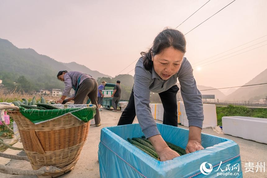 村民将刚刚采摘的黄瓜打包装箱。人民网记者 涂敏摄