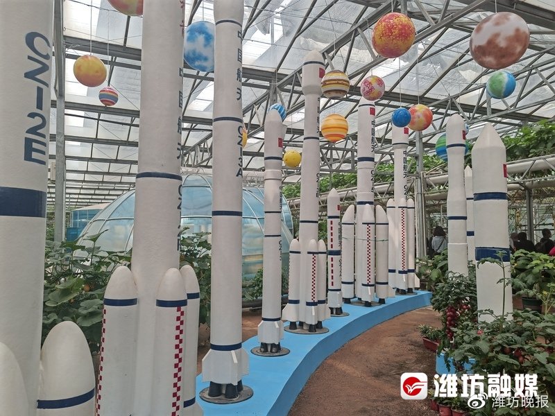 展馆中间位置,错落有致地放置了近年来我国自行研发的长征系列运载火箭模型,集中展示了我国航天事业的伟大发展成果;火箭背后则是用蓝色塑料板材搭建的“航天器”,里面各式作物生长旺盛。