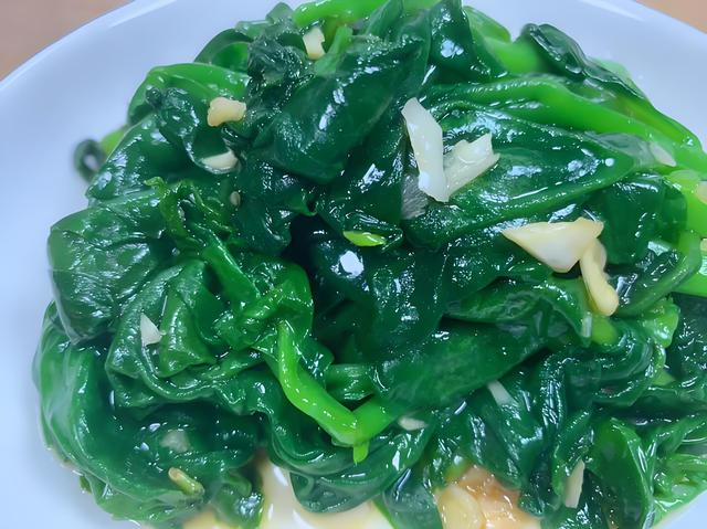 4、加一点点盐、一丁点糖(提鲜,吃不出甜味)调味,翻炒均匀,叶子蔫下去就立刻关火出锅!千万别炒老了。