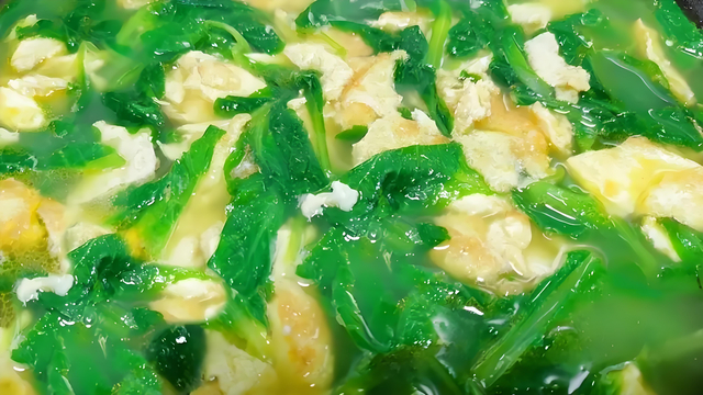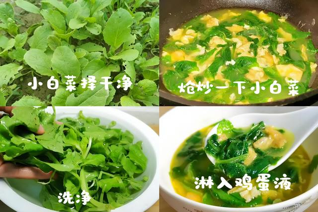 3、立刻放入小白菜段,用筷子轻轻拨散。小白菜一塌软,颜色转深绿,立刻关火!调入适量盐,滴上几滴灵魂香油即可。清汤映着翡翠般的菜叶,金黄蛋花点缀其间,看着就解暑。