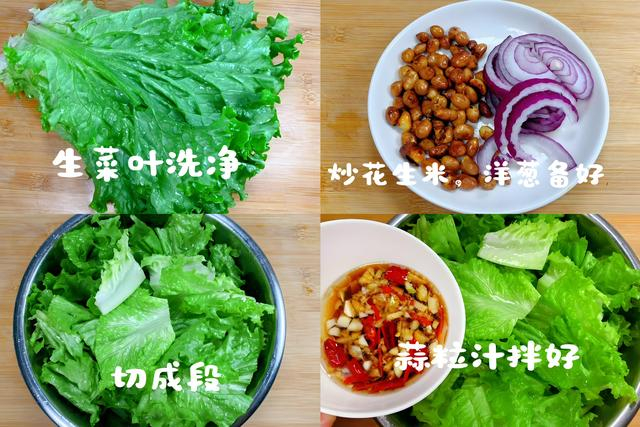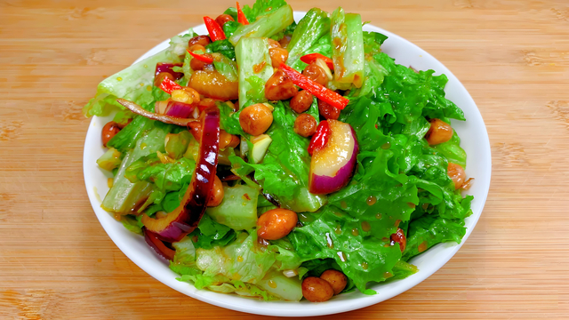 4、大碗中放入生菜叶、洋葱丝、油炸花生米,倒入调好的碗汁,下手(戴手套)或筷子快速而轻柔地拌匀即可。现拌现吃,生菜叶绝对不能蔫!每一口都是“咔嚓咔嚓”的爽脆交响。