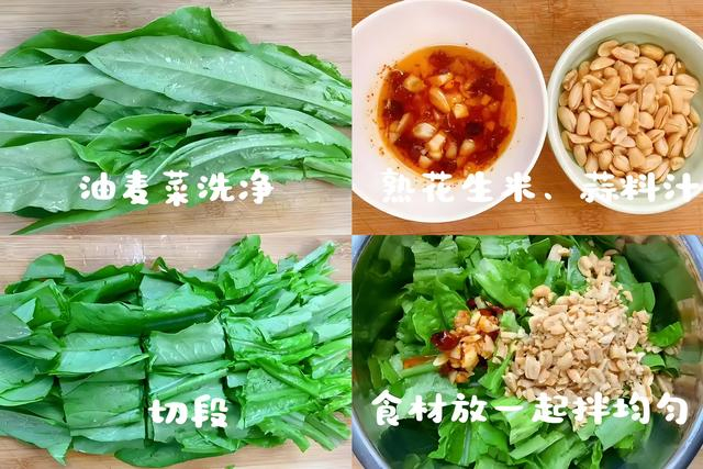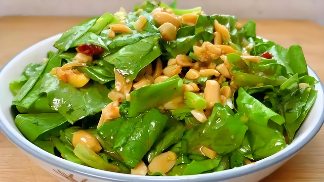 3、攥干的油麦菜码入盘中,浇上调好的酱汁,撒上喷香的花生碎和干辣椒段(怕辣可省),轻轻一拌,那麻酱的浓香裹着醋的微酸,直往鼻子里钻!