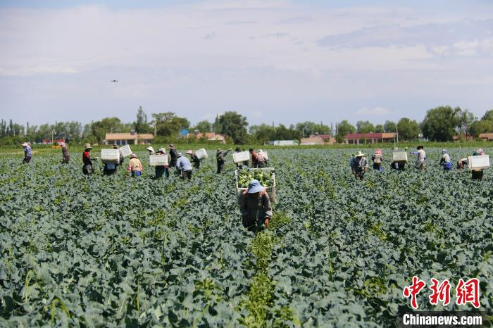 菜农采收西蓝花。 米婷 摄据了解,该基地通过与浙江临海市康生果蔬粮食专业合作社达成合作协议,形成了“技术指导+统一收购”的产销模式,不仅为农户提供田间管理技术,还统一组织收购和销售,并带动周边37户村民参与种植西蓝花700亩。