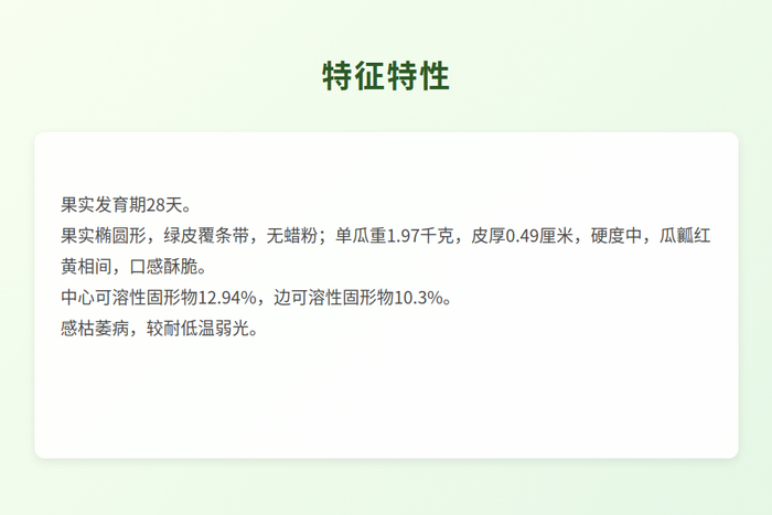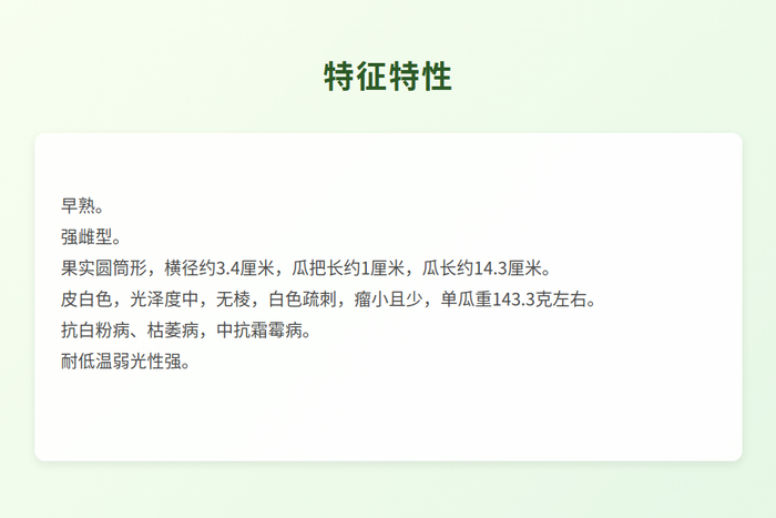 品种特性:功能型减脂黄瓜。色泽白嫩,口感清脆,高丙醇二酸,抑制糖类转化为脂肪。