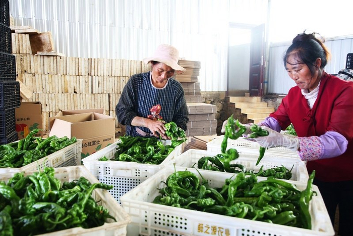 务工工人正在厂里内分拣刚采摘回来的螺丝椒。