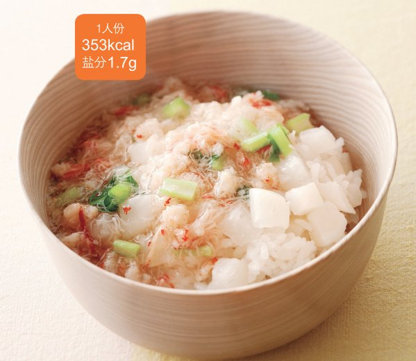 3. 锅内加水和蟹肉,温热后放入生姜泥和A中调味料,之后加入切碎的芜菁茎一起煮。煮好后调入水淀粉,收成浓浓的汤汁,浇在2中做好的饭上,然后可以根据个人喜好来选择加或不加芥末即可。