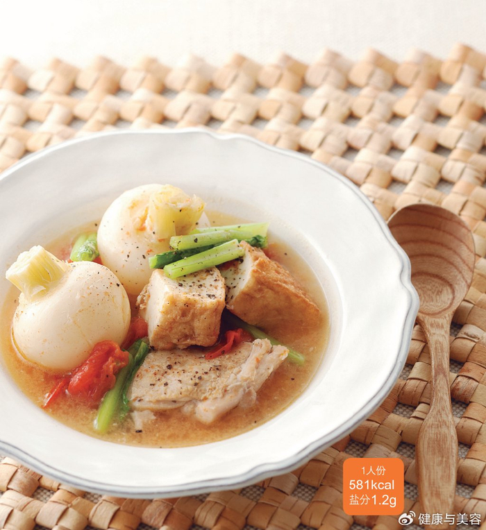 3. 放入1中处理好的圣女果和厚炸豆腐,用小火煮至入味,加盐和胡椒调好味,最后加入切好的芜菁茎和芜菁叶即可。