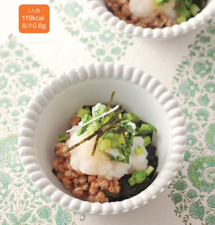 2. 将纳豆和切成容易入口大小的裙带菜,一起放入碗中将混合了纳豆调味料的芜菁泥盛在上面,再配上点海苔丝即可食用了。