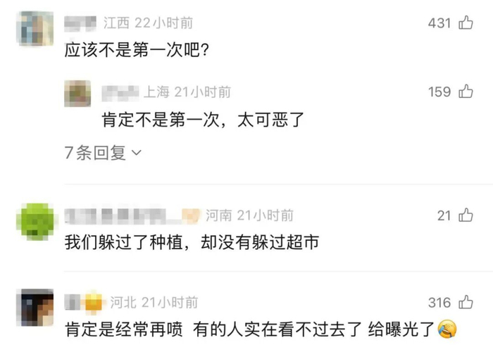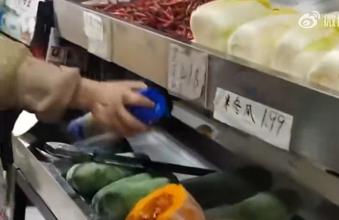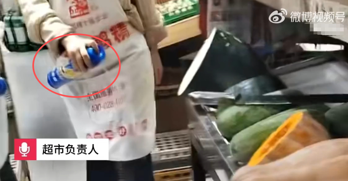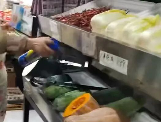 根据网友曝光的视频显示,一名女性工作人员手持一瓶蓝色喷剂,对着货架上摆放的青菜、南瓜等生鲜蔬菜直接喷洒,喷洒范围覆盖多个蔬菜品类。