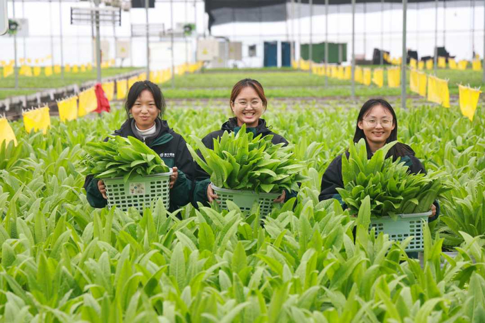 12月4日,四川省遂宁市安居区聚贤镇,工作人员在蔬菜大棚内采摘油麦菜。当地运用潮汐式苗盘无土栽培技术,实现病虫害防治、温度控制、湿度调节和精准营养现代化农业种植。