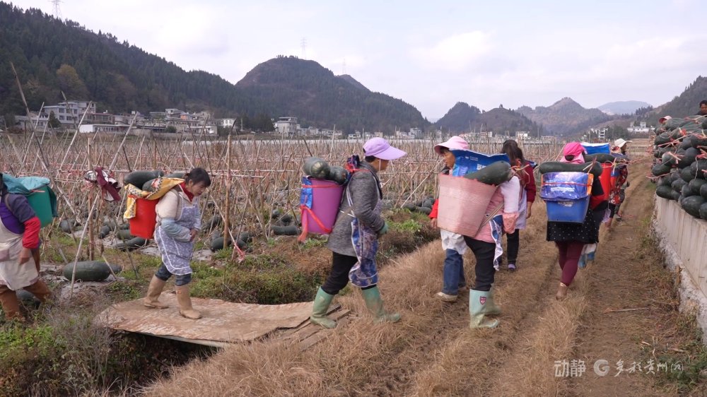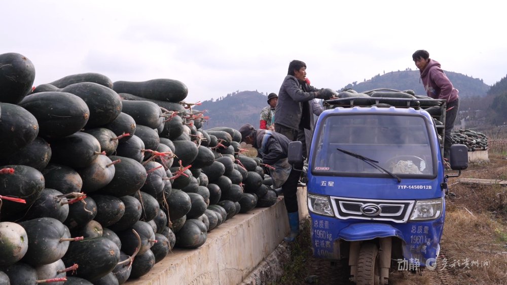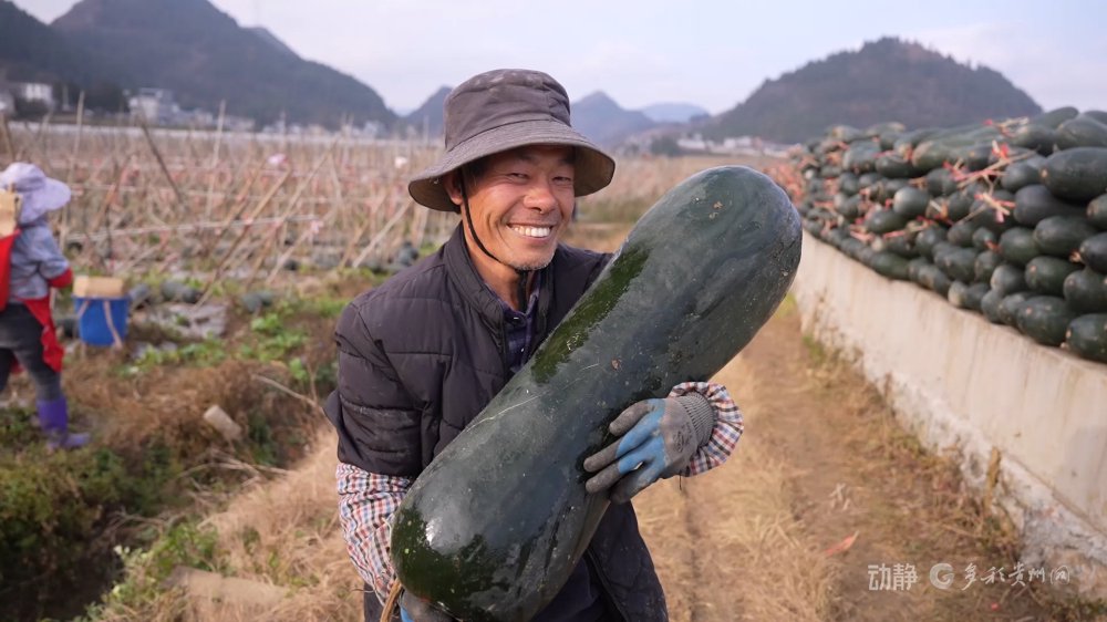 在六盘水市盘州市旧营乡坪田村的冬瓜基地里,80亩冬瓜迎来丰收,村民们正抢抓晴好天气采摘、搬运、装车。村民张德基一边擦汗一边笑着说:“一天100块钱,瓜好,心头肯定高兴。”