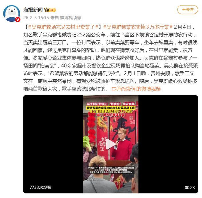 一句“在生活的细碎中,每个人用尽全力活出的纯粹,真的好美”,让歌手吴克群最近再次刷屏。不过这次,不是因为新歌,而是因为他客串“蔬菜拍卖师”,一小时帮贵阳菜农卖掉3万斤滞销蔬菜的暖心操作,被网友戏称为“从《为你写诗》到为你卖菜’”的硬核转型。
