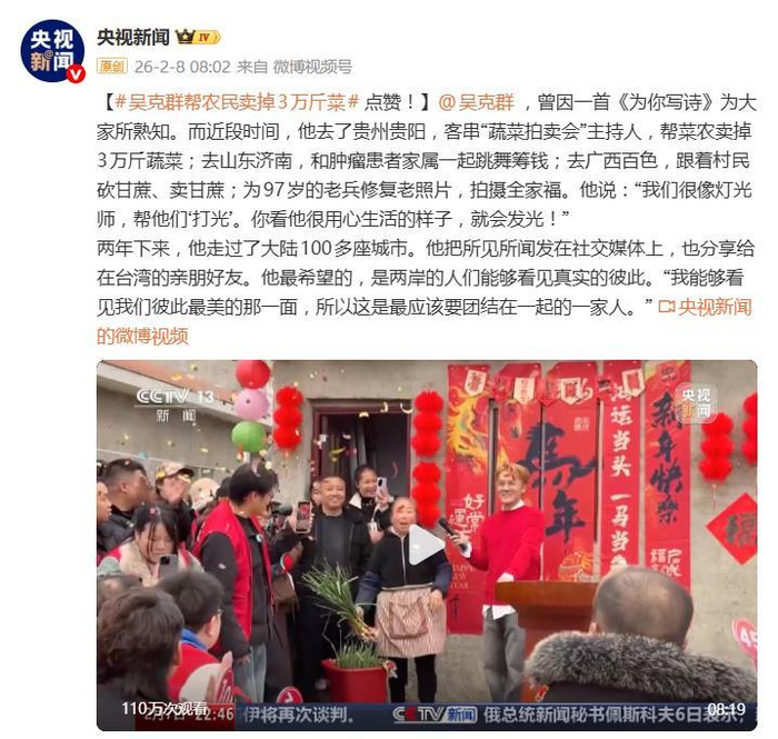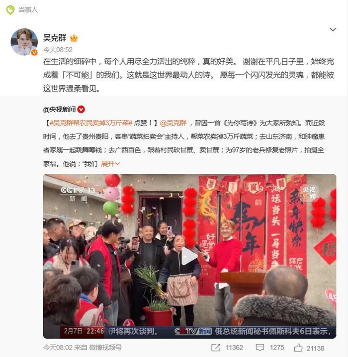 从舞台上的“为你写诗”,到田间地头的“为你卖菜”,吴克群的这场“转型”没有华丽的舞台,却收获了最真诚的点赞。它照见的不仅是一个明星的公益心,更是一种褪去光环、扎进生活细碎里的纯粹。当明星不再只是“秀”,而是成为连接困境与希望、疏离与理解的一束光,这本身,就是一首写给平凡人的最动人的诗。