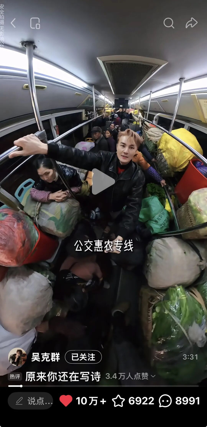 图为吴克群发布视频截图视频中,吴克群凌晨5点跟随菜农登上贵阳252路公交专线。“这是我见过最暖的一台车,明明是公交车却几乎没有地方下脚,满车都是蔬菜,司机还说你们打空手的就不能上’……”原来,这趟车专为菜农而设,帮助他们把乡村蔬菜销往20多公里外的城市。