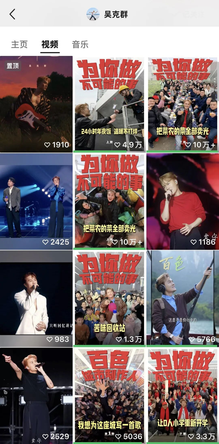 图为吴克群视频留言区网友评论帮助菜农卖菜,只是吴克群近年来参与的众多公益活动之一。和罕见病患儿家长一起跳舞筹钱、在废弃学校为留守老人办新年活动……他的社交媒体账号中,“为你做不可能的事”系列视频持续更新。